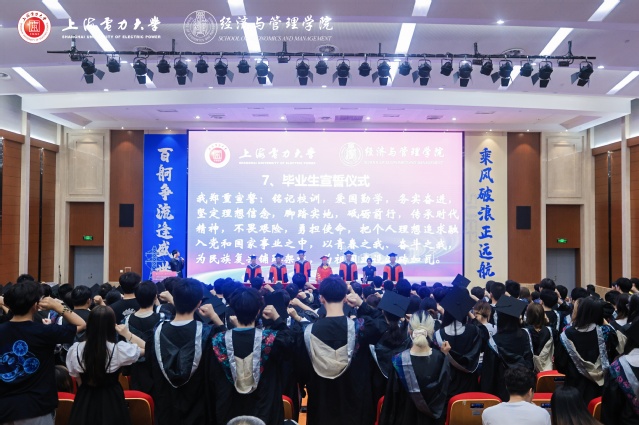 “铭记校训,爱国勤学,务实奋进,坚定理想信念,脚踏实地,砥砺前行,传承时代精神,不畏艰险,勇担使命,把个人理想追求融入党和国家事业之中,以青春之我、奋斗之我,为民族复兴铺路架桥,为祖国建设添砖加瓦。”铮铮誓言、字字铿锵!满怀激情的毕业献词呐喊出上电经管学子的心声与壮志。