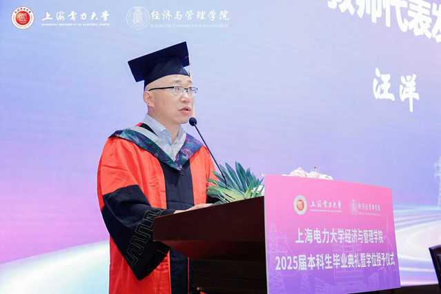 经管学院学位委员会委员、工程管理系主任汪洋作为教师代表发言,为即将踏入社会的学子指引方向。面对全球产业链重构、AI 重塑商业逻辑的复杂局势,汪洋提出四点建议:将不确定性转化为创新机遇,凭借专业知识在新兴领域发光发热;以专业能力建立确定性,在决策中践行管理学精髓;保持动态成长,持续更新知识技能;守护价值理性,坚守道德与原则。最后,教师代表鼓励毕业生,凭借疫情入学、经济复苏转型期毕业所锤炼的韧性,以专业智慧和努力适应并塑造时代,书写属于自己的辉煌篇章。