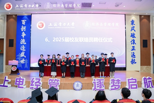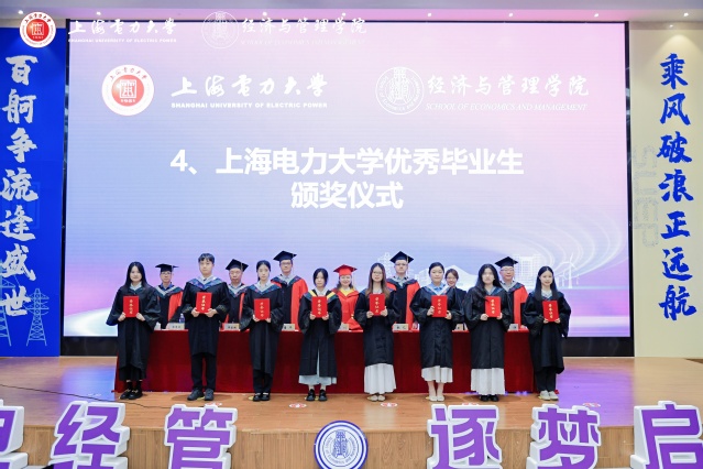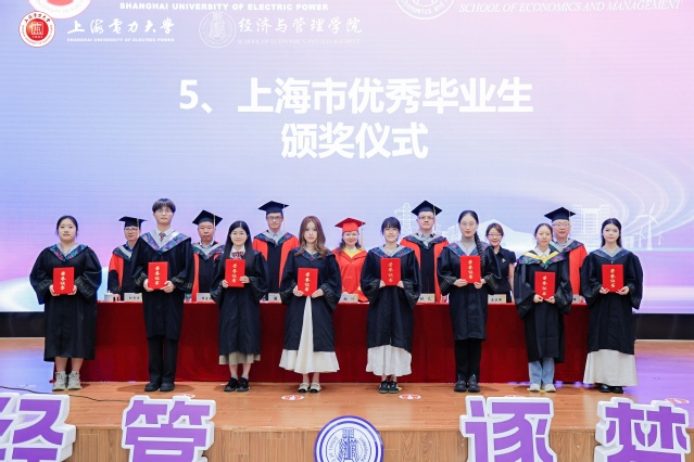 毕业典礼上,张艺宣读了经济与管理学院《2025届“上海电力大学优秀毕业生”表彰决定》。潘华宣读了《2025届“上海市普通高等学校优秀毕业生”表彰决定》。侯建朝宣读了经济与管理学院《2025届校友联络员聘任决定》。学院领导及教授代表分别为受表彰代表颁奖,为校友联络员代表颁发聘书。