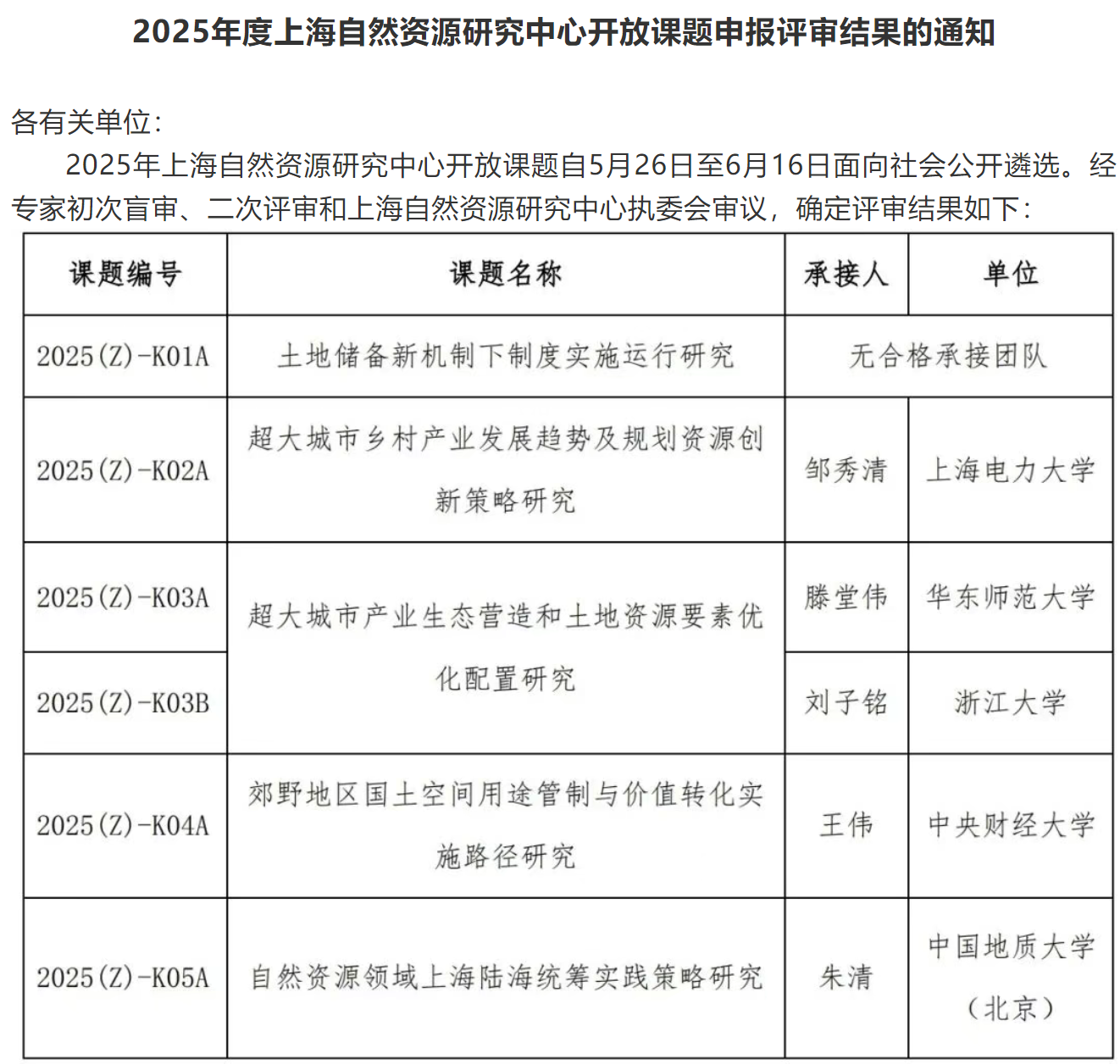 上海自然资源研究中心是上海市委宣传部于2020年设立的重点培育智库,也是上海首个专注于超大城市自然资源安全利用与保护的专业研究机构。该中心致力于研判自然资源管理的中长期重点难点问题,跟踪国际前沿动态,为政府决策提供科学依据。2025年度开放课题自5月26日启动申报以来,吸引了全国多家高校及科研机构的积极参与。经过专家盲审、二次评审及中心执委会审议,最终确定浙江大学、华东师范大学、中央财经大学、中国地质大学(北京)、上海电力大学五家单位的申报课题获得资助。