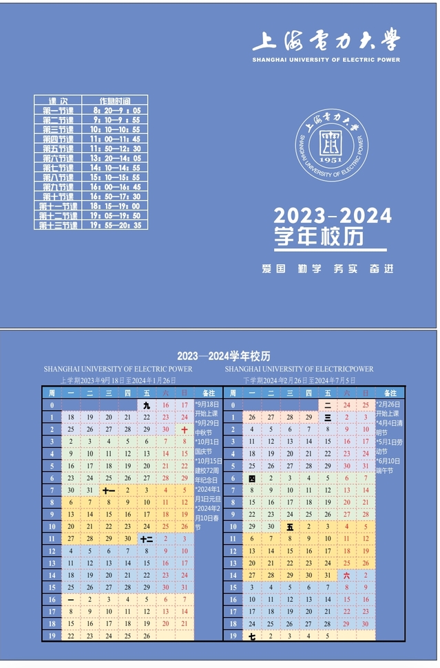 4.本学期教学周的具体日期和各上课节次时间点详见附件1:2023-2024学年上海电力大学校历。本学期班车安排详见:关于2023/2024学年第二学期班车运行方案的通知https://news.shiep.edu.cn/c7/82/c2679a247682/page.htm请各位老师合理安排好时间,严格遵守学校教学管理的相关规定。