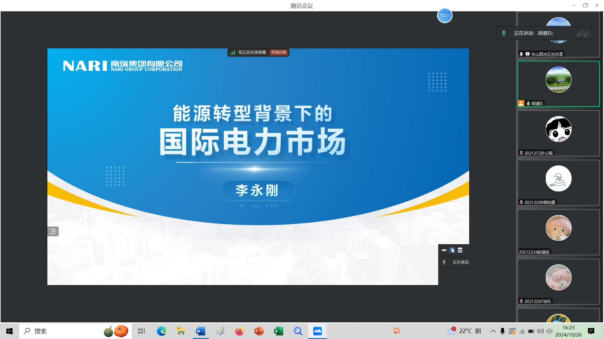 2024年10月26日下午,应用经济系邀请南瑞集团电力市场首席专家李永刚,就“能源转型背景下的国际电力市场”这一主题进行线上讲座。近年来,全球电力市场化改革在不断向前推进,具体表现为电力市场个数越来越多,市场化区域越来越大,电力市场规则也越来越完善。以此为背景,讲座首先介绍一个比较典型的电力市场,着重介绍新型电力现货市场的一些关键要素,其次从几个不同侧面介绍国际电力市场的发展演变,接着再简要介绍一下电力市场监管的关键考虑因素,最后总结国际电力市场的未来发展方向。应用经济系师生参加了讲座,并在讲座结束后与主讲专家进行互动交流,通过讲座大家提升了对未来国际电力市场发展趋势的认识,取得了一定的收获。