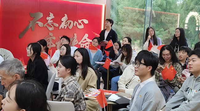随后,在“红歌颂党恩,献礼新时代”的环节中,张文杰、郑涵月、吴薛三位同学担任主持和领唱,他们通过趣味性的问答和领唱形式,带领大家回顾了多首经典红歌。同学们积极参与,热情高涨,不仅加深了对经典红歌的了解,还进一步激发了大家的爱国情怀和革命精神。在激昂的节奏中,青春的活力与红色的情怀完美融合,展现着新一代学子的蓬勃朝气和坚定信念,将此次党日活动的氛围推向了高潮。