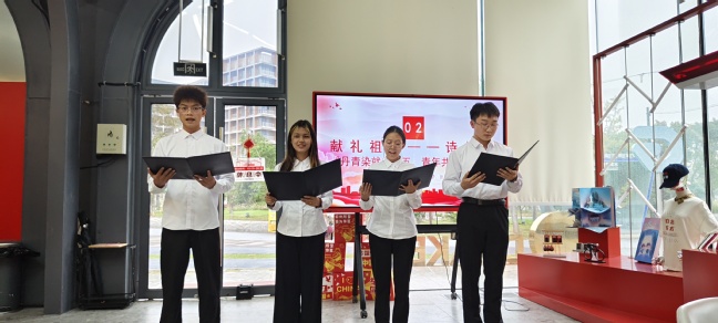 在“献礼祖国”环节中,汪彩琴、赵玥、吴长梦、张芯凯四位同学诵读《丹青染就七十五,青年共谱中华图》,他们用饱含深情的语调,将对祖国的热爱与祝福融入到诗歌的字里行间。他们不仅展现了青年学子的风采,更表达了对祖国繁荣昌盛的美好祝愿,也是对在场青年的激励和鞭策。