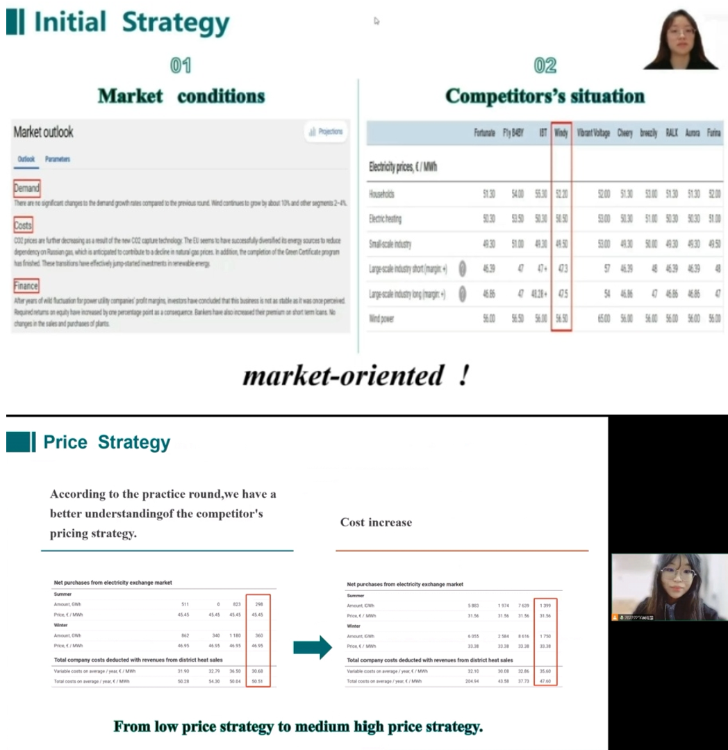 决赛阶段主要通过视频成果展示和云答辩介绍参赛项目,评委专家通过市场数据、商业决策、团队展示等对队伍进行考核。我校Windy团队在各方面展现出了卓越的实力,从校内赛中脱颖而出。她们始终坚持以市场为导向,凭借敏锐的洞察力深入分析市场趋势,并根据市场动态灵活调整定价策略,从而成功提升了市场占有率。与此同时,团队积极顺应市场和政策,致力于提高清洁能源的占比,为推动可持续发展做出了积极贡献。在比赛中,她们扎实的数据支撑、对市场局势的出色把控能力,以及在展示与答辩中所展现出的严谨条理性,共同构成了本次比赛的一大亮点。