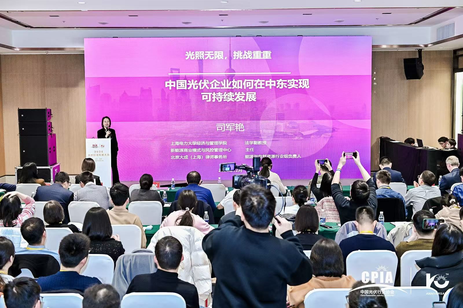 随着全球能源转型的加速,中东地区凭借其得天独厚的光照资源和积极的能源政策,正逐渐成为中国光伏企业出海的新热点。2024年12月5日,由中国光伏行业协会主办的“2024光伏行业年度大会”在四川省宜宾市举行。上海电力大学经济与管理学院司军艳副教授受邀在大会“海外光伏市场分析及投资机遇研讨会”中作“光照无限,挑战重重—中国企业如何在中东实现可持续发展”主题发言。