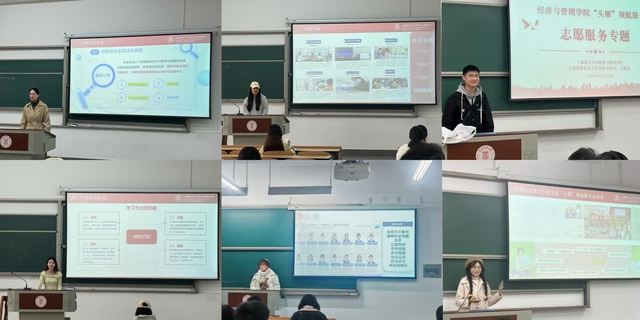 服务站党员徐嘉怡针对大一同学们做了一期科创科普,介绍了我校的创新创业实践活动类型、实践学分等;党员陈豪、袁晴分享她们参加知行杯暑期社会实践的经历和备赛体验,动员同学们将论文写在祖国的大地上,用汗水书写青春篇章。党员吴继慧、田留洋同志分享了自己作为进博会志愿者的感悟和收获,号召同学们在志愿活动中丰富自身的实践经验,培养社会责任感。