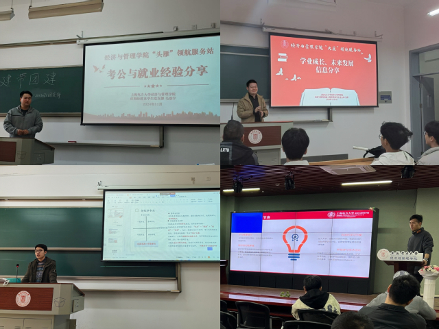服务站党员沈思利重点介绍了学校奖学金,以及自身学业规划的经验,以“博观约取,厚积薄发”为题鼓励同学们订立目标,早做规划;党员毛崇宇分享了考公经历,鼓励团员们多关注党政新闻,学习党的理论知识;研究生党员张波、陈汇沣分享考研经验,需提前做好规划,明基础、强化和冲刺阶段的学习目标和任务;吴薛传授了自己在实习面试的经验,了解自己的能力、性格特点,选择适合的就业方向,学习更好地展示自己。