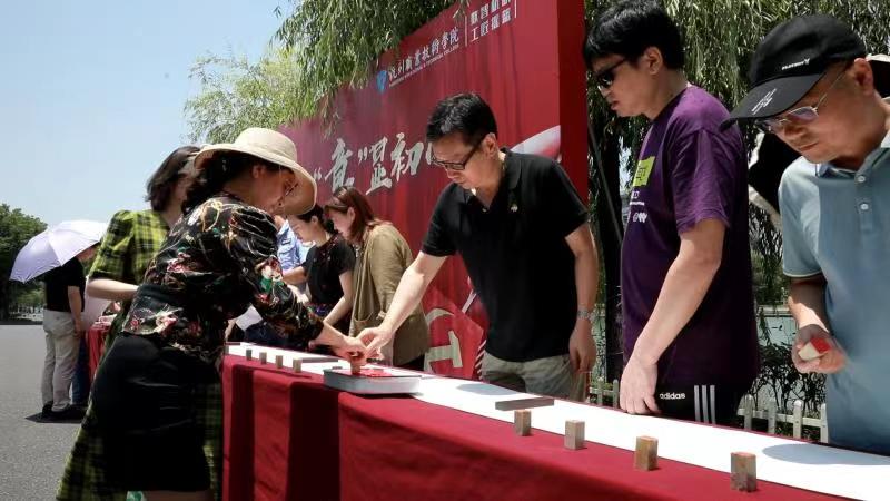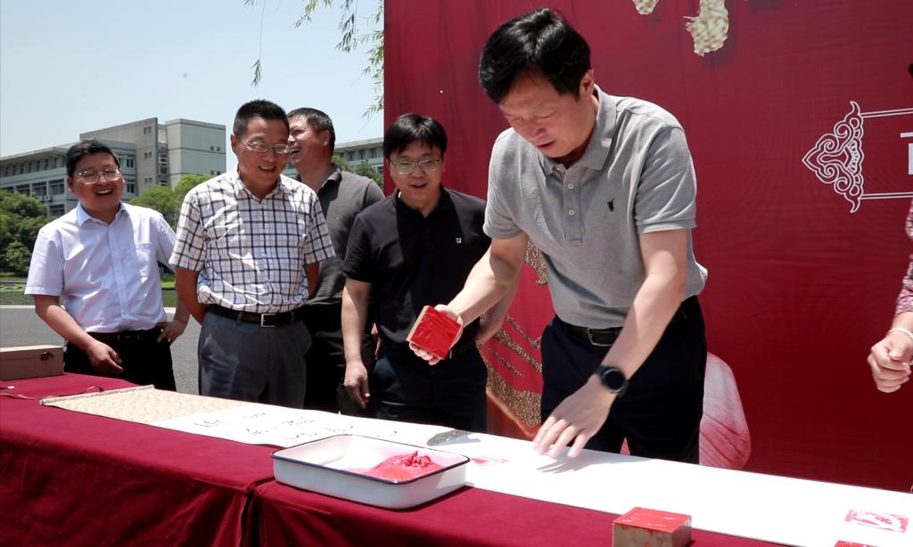 6月24日正午时分,十米印屏长卷在善湖边徐徐展开,一字排开的印章均是学校非遗传承教学基地西泠学堂师生的篆刻作品,印面有红船、党旗、党徽、100、清廉、校训等图文元素。校党委书记金波、校长徐时清,学校党政领导班子成员和百余名党员师生在现场进行了钤印。百章落印,捐赠学校,献礼党的百年华诞。