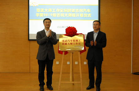 3月24日下午,范武技能大师工作室揭牌暨吉利汽车学院2019级吉利大师班开班仪式在学校第七会议室隆重举行,吉利汽车集团人才经营中心技能管理部部长、杭州轩宇分公司总经理林乃挺,人才经营中心校企合作经理沈志新,人才经营中心技能管理部运营规划经理高业春,吉利研究院试制中心技能大师范武、潘忠、刘明耀,学校纪委书记沈威,专业建设指导处处长、“双高办”常务副主任潘建峰,吉利汽车学院院长邵立东,党总支副书记张理剑,汽车制造与装配技术专业全体教师及2019级吉利大师班31位学员参加会议,会议由邵立东主持。