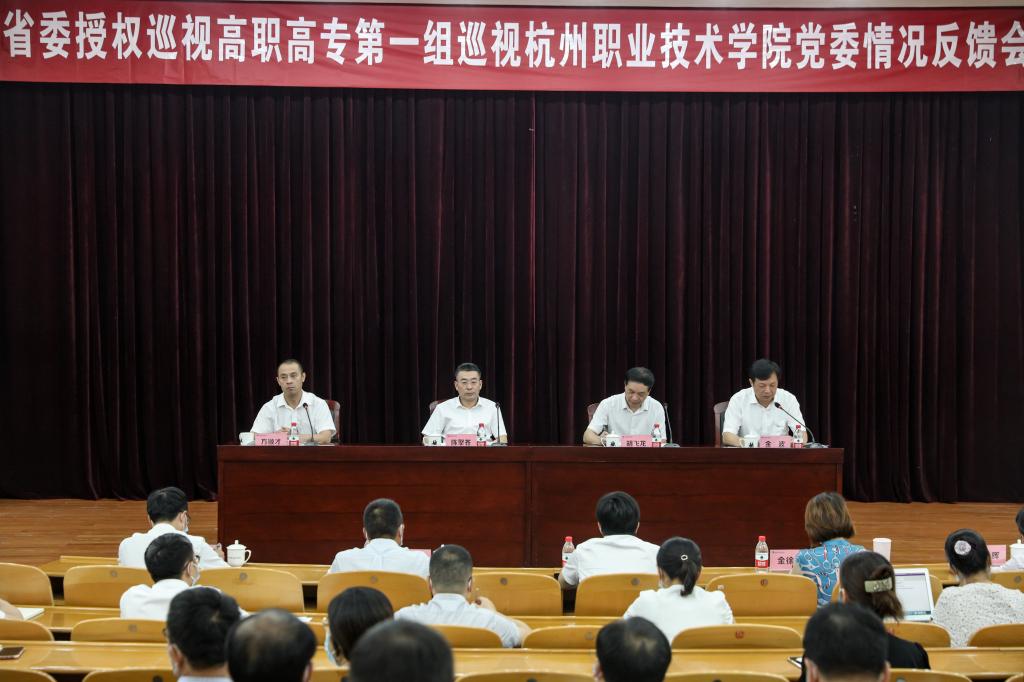 2021年9月2日,省委授权巡视高职高专第一组向杭州职业技术学院党委反馈巡视情况。市委常委、纪委书记、市委巡察工作领导小组组长陈擎苍出席向杭职院党委书记金波的反馈会议和向杭职院党委领导班子反馈会议,对巡视整改提出要求。陈擎苍向金波传达了省委书记专题会议、市委书记专题会议精神,省委授权巡视高职高专第一组组长方顺才代表授权巡视组分别向金波和杭职院党委领导班子反馈了巡视情况。金波主持领导班子反馈会议并作表态讲话。