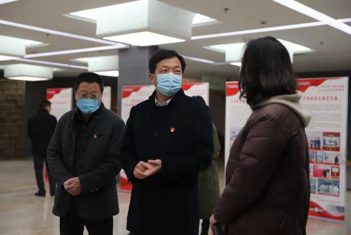 校党委书记金波、校党委副书记陈泉淼在相关职能部门负责人的陪同介绍下认真观看了展厅内的每一块展板。各党总支、直属党支部分批分时段参观了成果展。