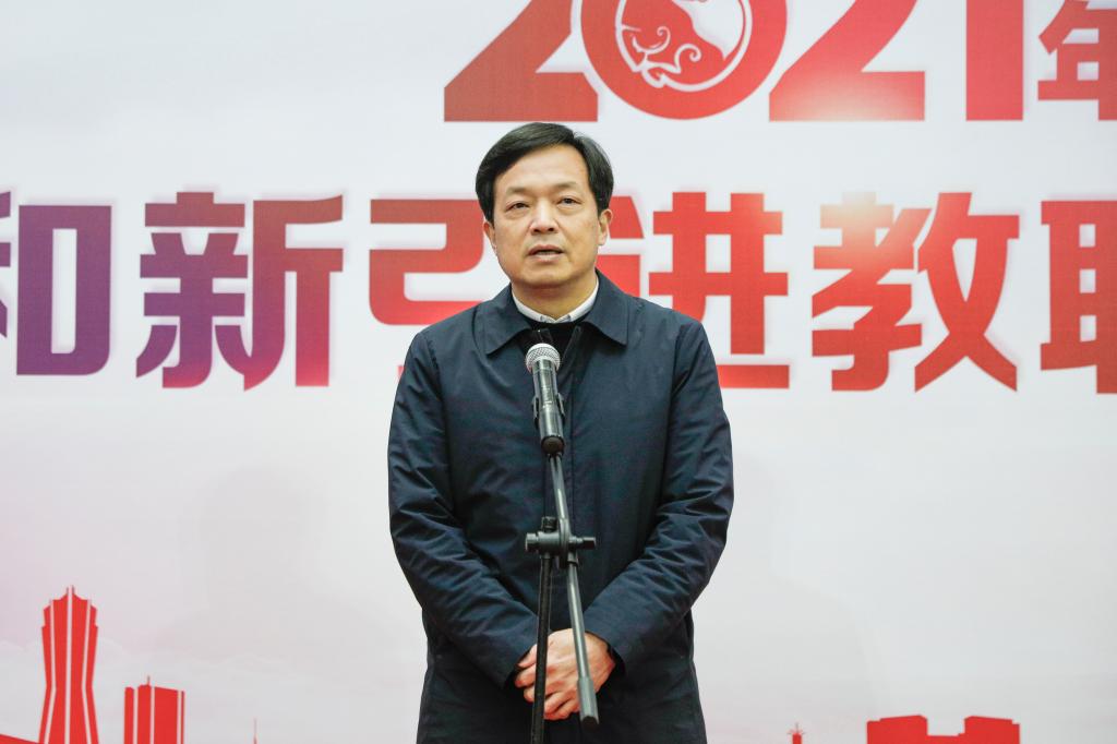 校党委书记金波向退休教师们为杭职院做出的贡献表示感谢,他指出,退休教师们是杭职院发展的坚守者、见证者、参与者,将青春年华奉献给学校建设,奉献给崇高的教育事业,学校今天的硕果离不开每位退休教师的辛勤付出。金波对全体教师提出四点期望和要求,一是按照习近平总书记的“四有”、“四个引路人”、“四个相统一”的要求,热爱教育事业,不断强化为党育人、为国育才的初心使命;二是按照职业教育规律,尽快过好教学关,备教材、备学生、备教法,主动听课、备课、磨课,牢牢站稳讲台;三是增强使命担当,加强科研工作,做好教学研究和学术研究;四是坚守正确的政治方向、政治原则、政治立场、政治道路,进一步提升境界格局,引导青年学生健康成长。