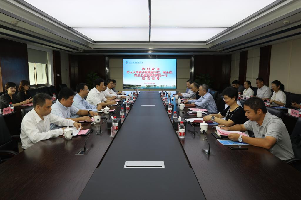10月15日上午,杭州市人大常委会党组副书记、副主任,市总工会主席郑荣胜,市总工会党组成员王越剑、陈新、沈慧、闻国平、陆舞鹄,以及市总工会办公室、政研室、经济工作部、宣传教育部、市教育工会、工会干部学校、劳模工匠协会办公室负责人来我校专题调研指导劳模工匠进校园工作。学校党委书记金波、校长徐时清、副校长楼晓春、程利群,党政办、宣传部、工会、专业建设指导处、马克思主义学院等部门负责人,教师代表陈楚、王赟、孟伟参加会议。