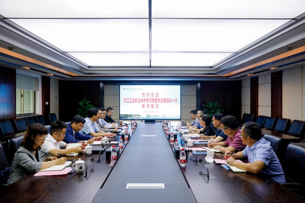 10月11日上午,浙江工业职业技术学院党委书记唐远彤一行来访我校。我校党委书记金波、副校长楼晓春、组织部部长麻朝晖,党政办、人事处、专业建设指导处、马克思主义学院负责人参与接待。