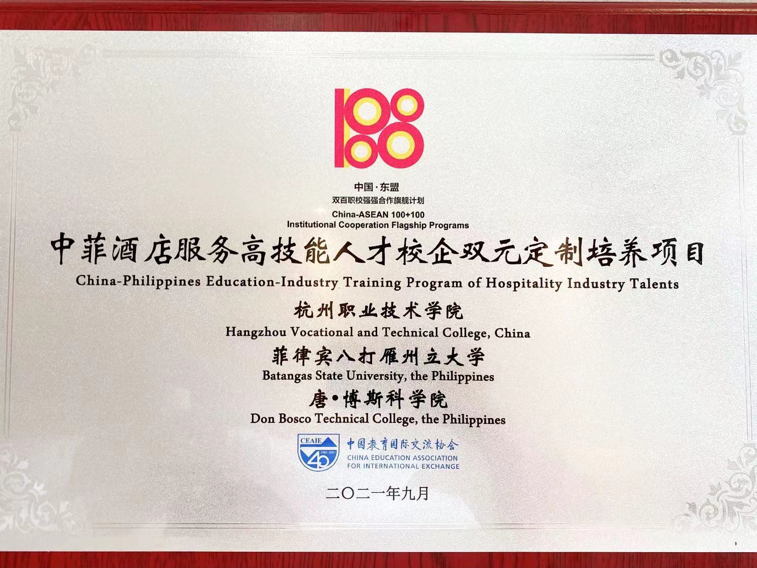 我校入选本次“中国-东盟高职院校特色合作项目”的是与菲律宾八打雁州立大学和唐·博斯科大学共同实施的中菲酒店服务高技能人才校企双元定制培养项目。楼晓春在经验成果分享中表示,该项目瞄准杭州“后峰会、亚运会”时期对酒店管理服务人才的需求,整合学校和高端酒店业师资力量,依岗设课,将高端酒店业的岗位标准转化为课程标准,为杭州城市国际化发展提供人才支持,学校将坚持以就业为导向,充分发挥专业优势,不断探索区域特色留学生培养模式。