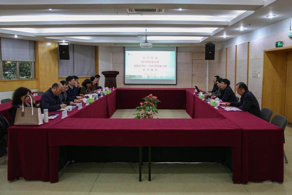 1127日上午,扬州市职业大学党委副书记、校长潘锦全一行来访我校。我校校长徐时清、副校长陈加明,党政办、马克思主义学院、发展研究中心相关负责人参与接待。