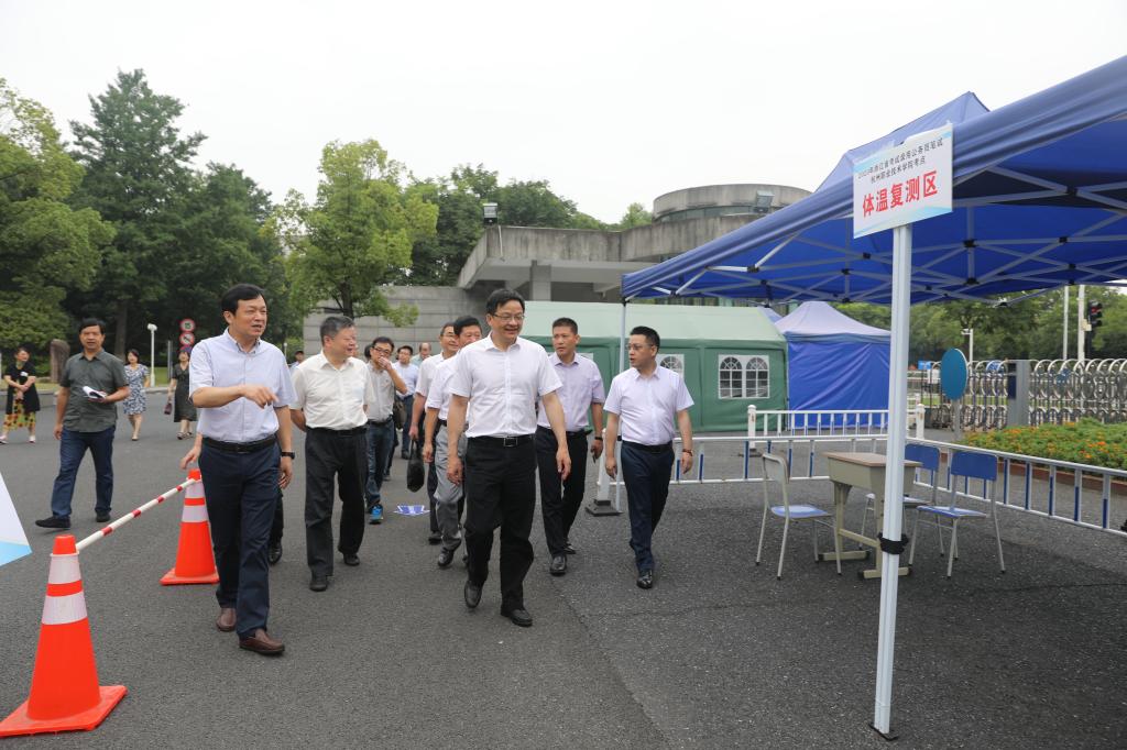 胡旭阳一行对学校南大门、测温通道、临时隔离区、应急医疗点、标准考场、特殊考场、考务指挥中心等进行了实地走访巡查,现场就考务组织、防疫防暑等各项筹备工作的进展情况进行了细致询问和深入了解。