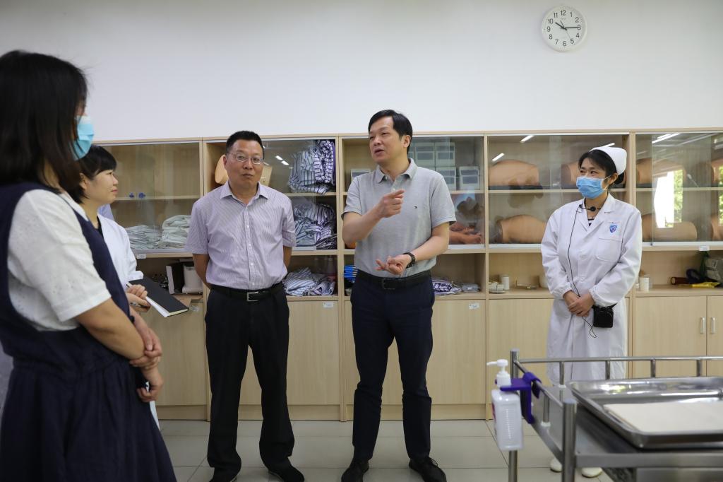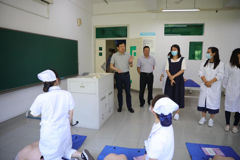 金波一行实地走访了基础生命BLS实训室、康复护理综合实训室、基础护理实训室等,向正在实训的师生详细了解课程开展情况。在现场体验了手动血压计血压测量后,金波对护理专业师生积极投身抗击疫情给予高度评价,对同学们操作技能给予充分认可。他援引习近平总书记的话勉励师生:“伟大出自平凡,英雄来自人民”,希望大家扎实筑牢专业技能,练就过硬本领,投身护理事业,践行南丁格尔精神。