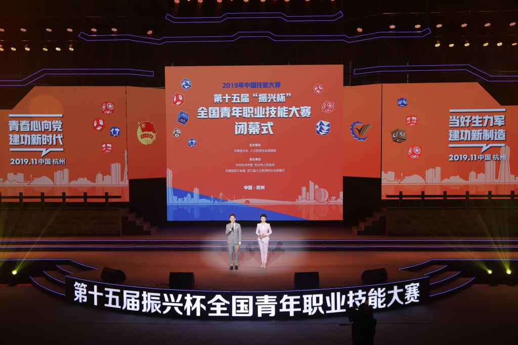 11月18日上午,2019年中国技能大赛第十五届“振兴杯”全国青年职业技能大赛闭幕式暨全国青年技能人才培养交流分享会在我校举行。团中央青年发展部副部长尹虓,人社部职业能力建设司副司长权雅宁,杭州市人大常委会副主任、市总工会主席郑荣胜,杭州市政府副市长陈国妹,团浙江省委党组成员、组织部部长盛乐,浙江省职业技能鉴定指导中心主任陈国送,团杭州市委书记马利阳,我校党委书记金波以及团中央、市政府、市教育局、杭报集团等相关领导和嘉宾出席闭幕式。