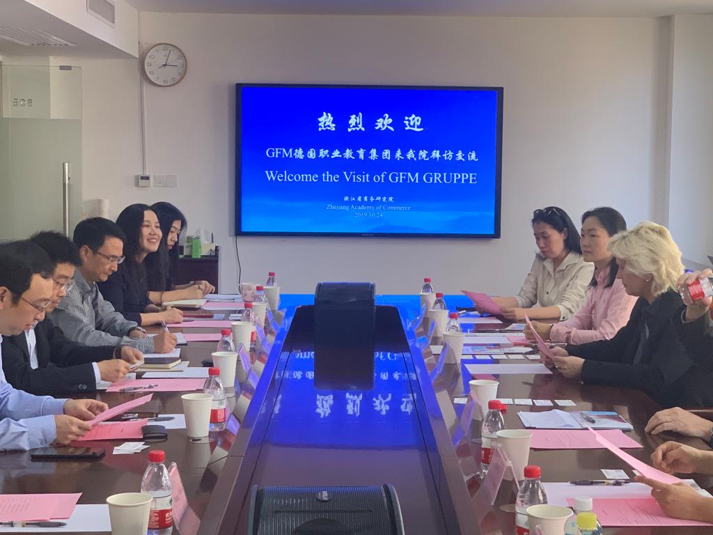 10月24日下午,副校长楼晓春一行前往浙江省商务厅与GFM德国职业教育集团对接交流。德国GFM教育集团总裁Freiling先生、集团CEO Hoffmuller女士,浙江省商务厅对外经济联络处处长阮刚辉、商务研究院院长兰健,以及相关企业代表出席座谈会。