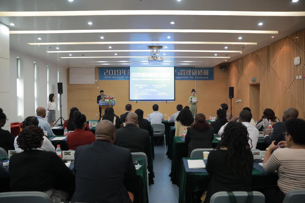10月19日上午,2019多米尼克旅游开发与管理研修班开班仪式在我校图书馆第七会议室隆重举行。浙江省商务厅外经处调研员范爱华、浙江省商务认证中心主任陈永红、我校副校长楼晓春,国际交流合作处、商贸旅游学院、继续教育学院相关负责人,以及来自多米尼克的24名学员共同参加仪式。
