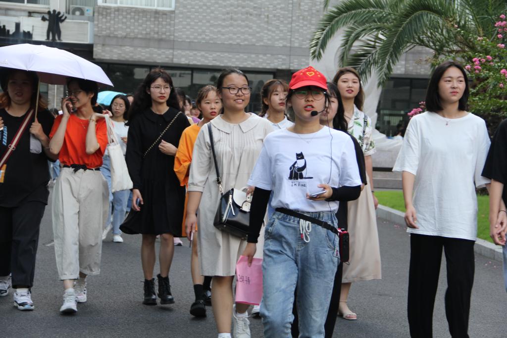 新生们在旅游专业同学的带领下从校史馆出发,穿梭于学校的各个建筑之间、漫步于林荫小道之上、沐浴在善湖秋日阳光之下、徜徉在校园桂香之中,听旅游专业的小导游仔细讲解学校建筑的功用,诉说学校内各个雕塑小品的内涵。