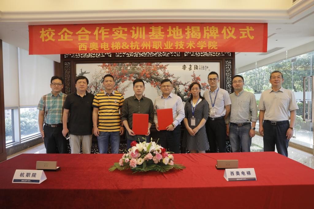 会上,西奥电梯有限公司总裁周俊良和杭州职业技术学院校长贾文胜共同签订了校企合作协议,双方将围绕“五一贯制学徒班”建设,在师资、技术、设备、学生实习就业等方面开展深度合作。周俊良、贾文胜还共同为“校企合作实训基地”揭牌。