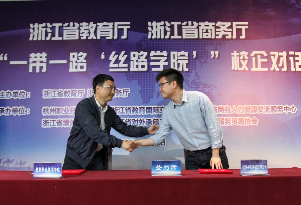 会上,省教育厅副厅长丁天乐、省商务厅副厅长胡潍康签署了《省教育厅 省商务厅合作共建“‘一带一路’丝路学院”谅解备忘录》,杭州职业技术学院与海兴电力股份有限公司、浙江经贸职业技术学院和浙江机电职业技术学院与华立集团签订了共建“丝路学院”意向书。温州职业技术学院、华立集团分别代表“走出去”学校和企业作交流发言。