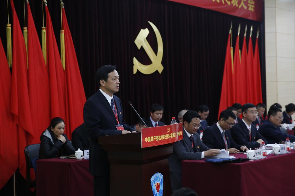 在全场的热烈掌声中,我校党委书记金波代表中共杭州职业技术学院委员会作题为《勇担使命,砥砺奋进,为建设国内一流、国际上有较大影响力的“高职名校”不懈奋斗》的报告。本次大会主题是:高举习近平新时代中国特色社会主义思想伟大旗帜,以党的十九大精神为统领,认真贯彻全国教育大会精神和省市委决策部署,全面落实立德树人根本任务,全面加强党的领导,团结动员全校党员和师生员工,深化改革,聚力发展,勇担使命,砥砺奋进,加快建设国内一流,国际上有较大影响力的“高职名校”,为杭州加快建设独特韵味别样精彩世界名城、打造展示新时代中国特色社会主义的重要窗口作出新的更大的贡献。