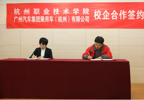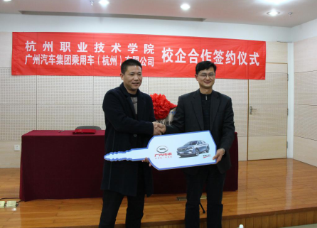 12月12日下午,杭州职业技术学院—广州汽车集团乘用车(杭州)有限公司校企合作签约仪式在第三会议室隆重举行。广州汽车集团乘用车(杭州)有限公司副总经理钟绕东、人力资源科科长戴昱、招聘系系长施军钢,杭州职业技术学院副校长陈加明,专业建设指导处、产学合作处、友嘉机电学院、青年汽车学院相关负责人,以及汽车制造与装配技术专业组全体老师和大一全体同学出席签约仪式。仪式由邵立东主持。