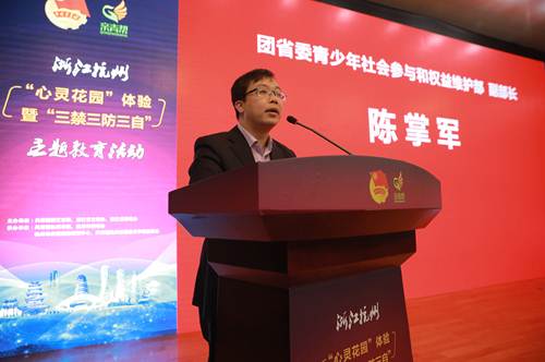 团省委青少年社会参与和权益维护部副部长陈掌军上台致辞,介绍了近年来团省委在“三禁三防三自”的主题教育活动品牌中取得的成效,充分肯定了我校在法制宣传教育工作方面所做的工作。他指出,校园是青少年成长环境的重要组成部分,杭州职业技术学院要切实利用“三禁三防三自”等主题鲜明、形式多样的普法教育和道德实践的活动品牌,努力把活动参与率转化为有效宣传率,不断提高共青团维护青少年合法权益、服务青少年健康成长的工作水平。他呼吁广大学生认真学习平安自护知识,不断强化防范意识,切实提高安全自护能力,在校园做个自律的好学生,在家庭做个自护的好标兵,在社会做个安全的好卫士。