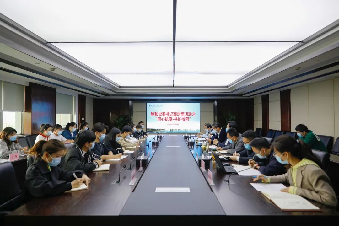 为进一步宣传学校疫情防控政策,教育引导广大师生落实落细疫情防控各项要求,同时听取同学们对学校疫情防控工作和管理服务方面的意见建议,通报学校疫情防控的工作情况,4月18日下午,杭职院在行政楼528会议室召开了“我和党委书记面对面之同心抗疫·共护校园”座谈会。校党委书记金波,党委副书记陈泉淼,副校长程利群,相关职能部门负责人与来自各二级学院的16名学生代表一道参加座谈交流。座谈会由校团委副书记楼黎瑾主持。