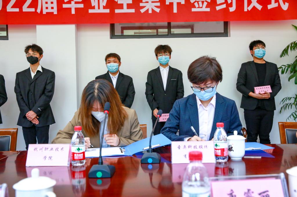 随后,与会企业领导与各专业毕业生代表进行了现场签约。营销1912班陈妮作为毕业生代表分享了自己在圣奥集团实习的收获和成长,表达了对学校和企业精心培育的感恩之情,并号召全体毕业生树立正确择业观,以匠心逐梦未来。