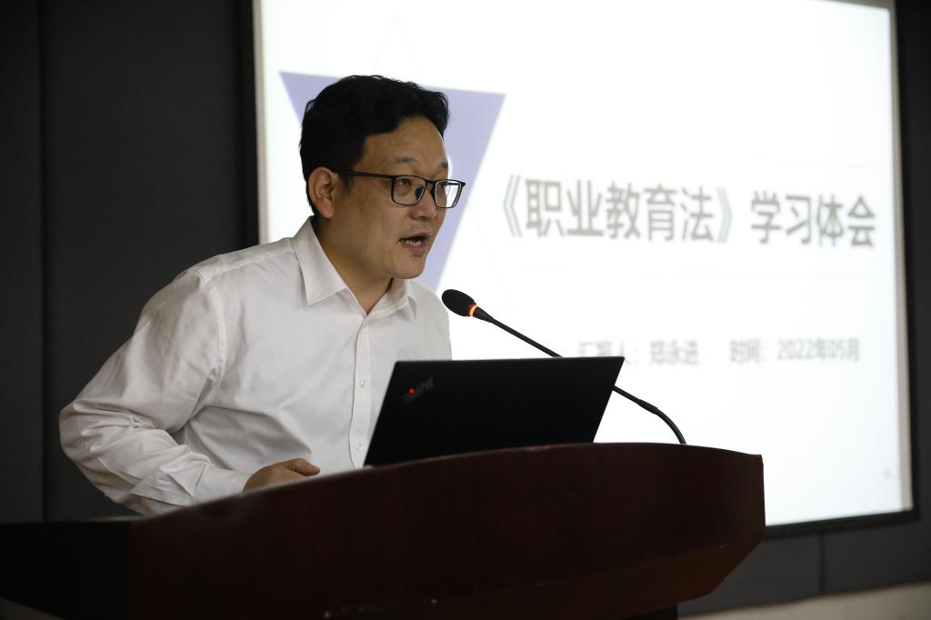 会议第一阶段邀请了党政办、发展研究中心负责人郑永进博士、教授作新《职业教育法》专题辅导报告。他从修订概况、主要内容、十大突破和个人思考等四个方面,详细介绍了新《职业教育法》的出台背景、内涵要义并交流了学习体会。他指出,新《职业教育法》围绕“职业教育与普通教育同等重要”这个基本定位,通过明确职业教育类型属性、完善职业教育内涵,系统构建了职业教育法律制度体系与保障体系,为理顺职业教育管理体制,压实地方主体责任,明确各级各类职业院校的法定职责,明确行业企业实施职业教育的法定义务等奠定了良好法律基础,具有里程碑式意义。下一步,对学校而言,关键是认真贯彻落实新职业教育法的新精神、新规范和新要求,推进全面依法治教、依法治校。
