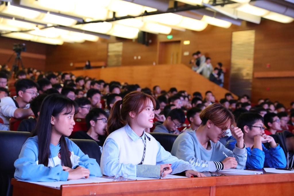 随后,贾文胜列出生涯、生涯发展、生涯探索、未来发展四个不同的计算公式,清晰深刻地阐明了选择与发展之间的辩证关系。他告诫同学们只有忠于理想,坚定地选择,百分百地努力与付出,脚踏实地达成每一个具体的小目标,才有可能最终实现职业发展的大理想。