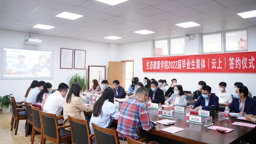 5月11日上午,生态健康学院举行了2022届毕业生集体(云上)签约仪式。副校长金徐伟,职业发展与就业指导中心、生态健康学院相关负责人以及6家企业代表、签约毕业生一同参加了此次活动。