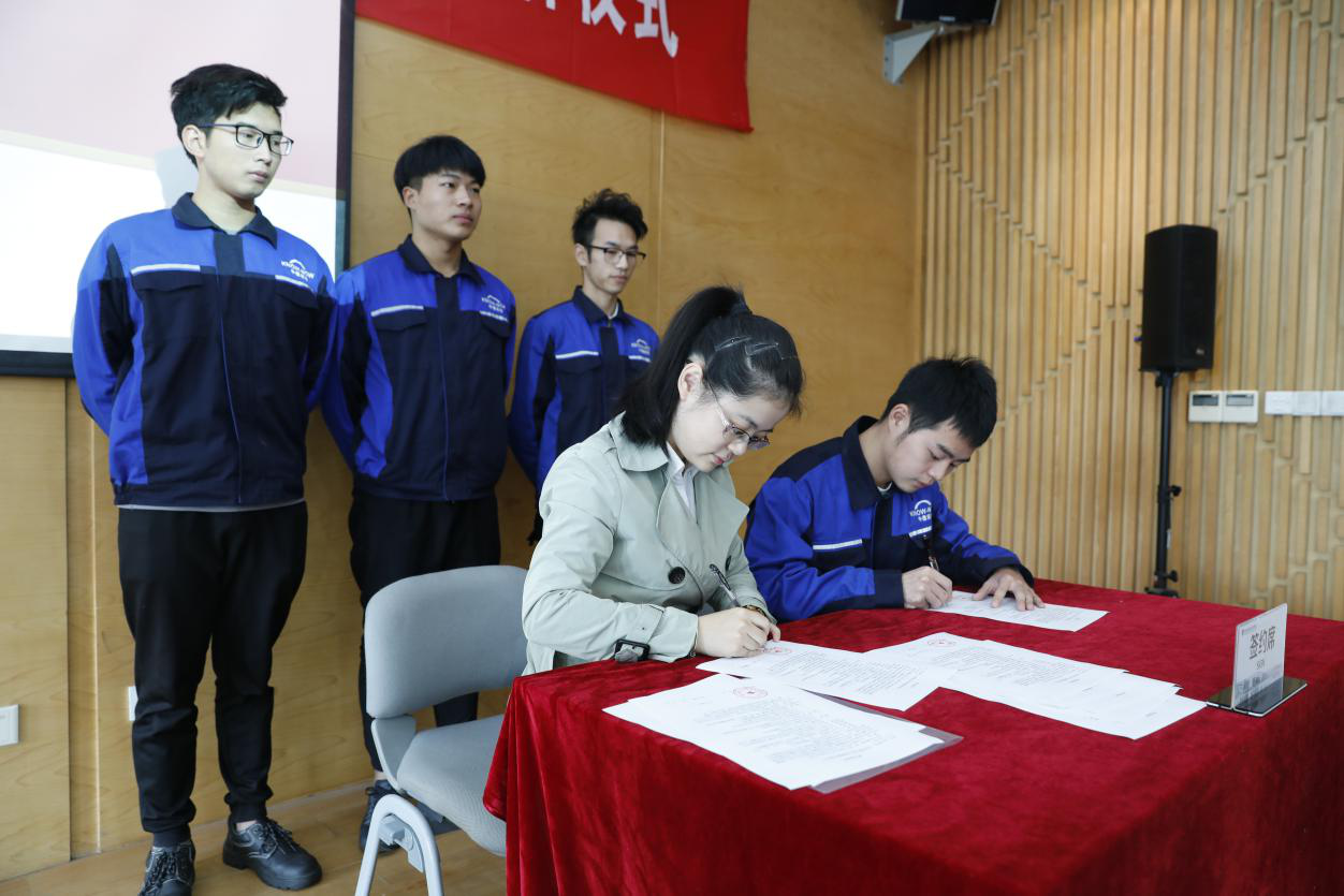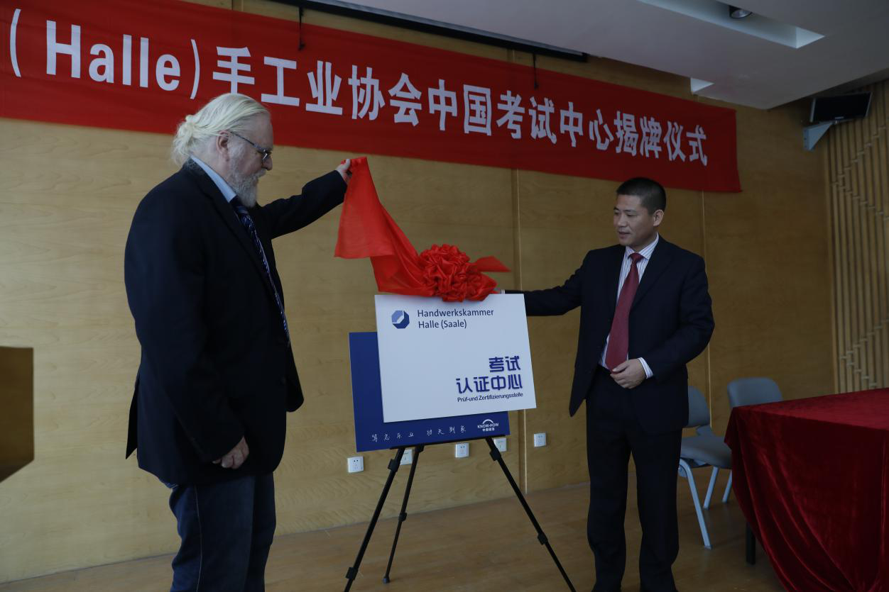 DCG哈勒德中协会国际学院院长汉斯·乔治· 凯恩和杭州职业技术学院副校长陈加明共同为“德国哈勒手工业协会中国考试中心”揭牌,在杭德国品牌汽车企业与中德诺浩学生代表签就业协议书。