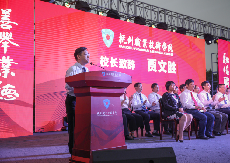校长贾文胜发表热情洋溢的致辞,他首先代表学校党政领导和全体教职员工真诚地欢迎2018级新同学融入杭职院。在发言中,他向新生介绍了学校的办学定位、办学模式、办学理念、校训精神,告诉新生们今天选择杭职,明天将收获与众不同的精彩人生。在发言中,贾文胜给同学们提出三点希望和要求:一是要善学,深耕学问,做新时代的扬帆者。希望同学们珍惜大学时光,勤学知识,精练技能,做新时代的扬帆者,成为社会发展需要的“匠才”;二是要善谋,志存高远,做新使命的担当者。希望同学们不仅要谋事,精心设计自己未来三年的学习生活,还要谋域,系统规划自己将来的职业生涯,更要谋势,认清高职教育发展的新形势,坚定高职学子的大自信。三是要善为,敢闯敢干,做新征程的践行者。希望同学们要在和辅导员、班主任的交流谈心中,在同专业教师的学习互动中,在与企业师傅的技能切磋中汲取营养、练就本领,养成敢为的胆识、善为的能力、真为的品质,在杭职做出一番成绩,在未来干出一番事业。
