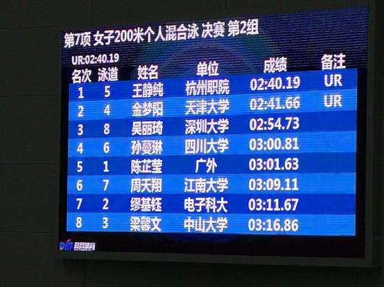 本次比赛,我校共派出四名女运动员参加,分别是达利女装学院的吴江南、李颖儿,商贸旅游学院的王静纯和信息工程学院的范宇晨。四位同学在教练李曲波老师的带领下,参加了11个项目的角逐。队员们经过奋力拼搏,共获得6块金牌、1块银牌,其中商贸旅游学院的王静纯同学获得200米个人混合泳、50米蝶泳金牌。更可喜的是,王静纯同学在200米个人混合泳中力压群雄,不仅获得了冠军,还以2分40秒19的成绩打破了全国纪录,被大会评为优秀运动员。达利女装学院的吴江南同学获得50米自由泳、100米自由泳冠军。四位同学经过顽强拼搏,获得了4×100米混合泳接力比赛的金牌、4×100米自由泳接力金牌、4×50米自由泳接力比赛银牌。