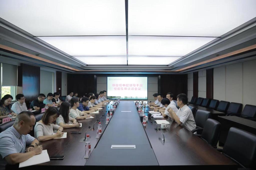 8月8日,校党委召开新提任中层领导干部集体谈话会议,对新提任的24名中层领导干部进行任前集体谈话。党委书记金波、校长徐时清、党委副书记陈泉淼、纪委书记高云飞、组织部长麻朝晖出席会议,会议由陈泉淼主持。