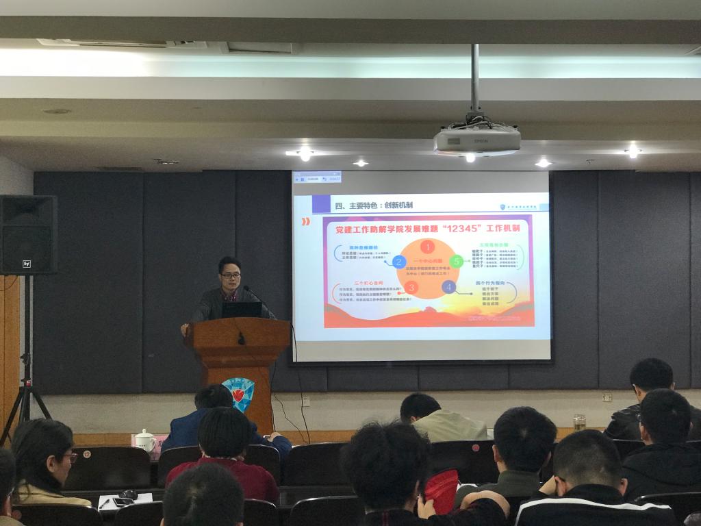 各二级党组织根据前期党支部自评、党支部书记述职情况推荐一个党支部参加本次评审会。会上,各申报党支部负责人以PPT形式从党支部经常性工作开展情况、重点工作开展情况、发挥党建思想引领作用情况、工作成效及特色等四个方面对2017年党支部工作进行限时6分钟的汇报,参会代表对13个申报党支部进行现场打分。