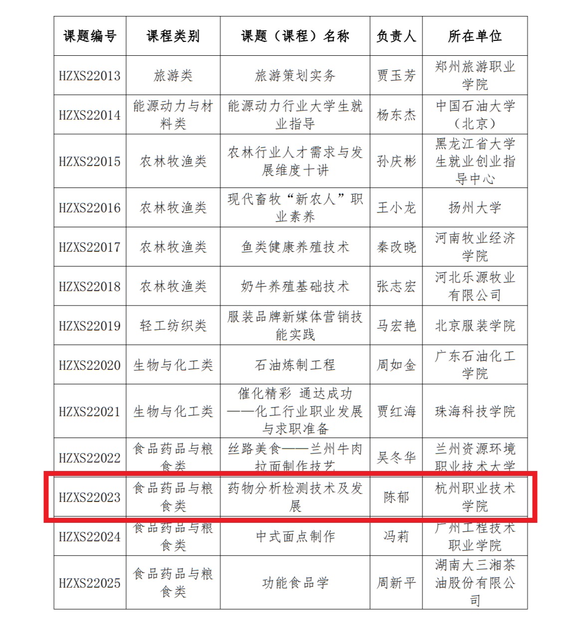 日前,教育部学生服务与素质发展中心公布了《2022 年宏志助航计划线上课程建设课题立项通知》,我校生态健康学院陈郁老师主持的《药物分析检测技术及发展》榜上有名,为全省唯一入选高校。