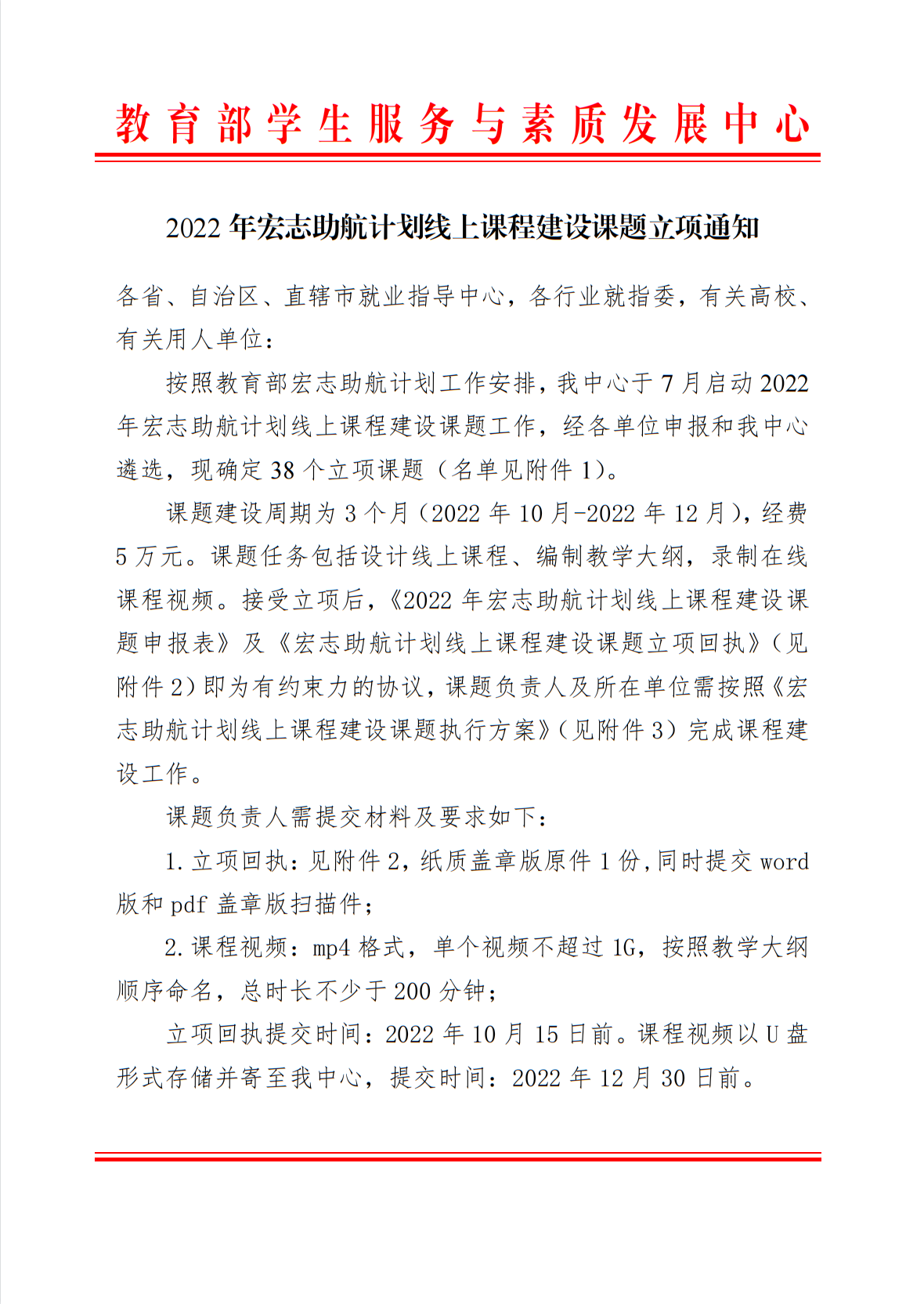 2022年宏志助航计划线上课程建设课题自2022年7月启动申报工作,主要面向各地高校、重点事业单位及各省级就业部门,要求聚焦高校毕业生职业技能提升,反映行业发展的前瞻性趋势,突出实操实战特色,我校限报1项。经全国学生发展中心遴选,共38个立项课题。