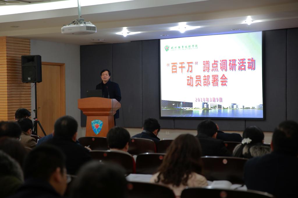 校党委书记金波作动员讲话。他指出,校党委对开展“百千万”活动高度重视,根据市委推进“百千万”活动常态化制度化工作部署会的精神,进行了专题研究和安排。学校成立了由党委书记和校长分别担任组长、副组长的领导小组,统筹安排活动的开展。金波要求全校干部一要提高认识。推进“百千万”活动的常态化制度化,是贯彻落实习近平新时代中国特色社会主义和党的十九大精神的必然要求,是贯彻落实乡村振兴战略、夯实农村基层基础的有效手段,是坚持问题导向、凝心聚力推动中心工作的有效举措,是切实转变干部作风、提升干部综合素质的有效途径,也是学校提升服务经济社会发展能力、深化教育改革的有益探索。二要把握重点。抓好“365”基本运行体系的落细落小落实,即明确3个时段环节、落实6项重点任务、健全5个方法机制。在3月份集中蹲点调研期间,要切实做到调研工作“全覆盖”,把握聚焦初心使命、聚焦乡村振兴、聚焦矛盾化解、聚焦问题解决、聚焦基层创新“五个聚焦”的调研重点,高质量完成“十个一”的调研具体任务。三是严格要求。他要求每位干部要精心准备、虚心好学,在调研过程中要落实举措、保障安全,整个活动的开展要注意营造氛围、严明纪律,共同努力把“百千万”活动开展好,向市委交上一份满意的答卷。