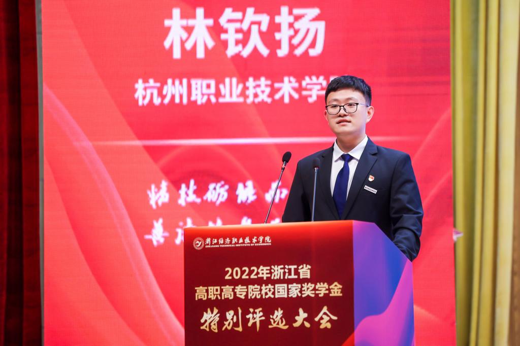 我校信息工程学院2020级信息安全技术应用专业林钦扬同学,通过视频展示、个人陈述等环节的风采展示,讲述自己精技砺能而行远,善德修身而有为的成长经历和青春奋斗故事,最终斩获浙江省高职高专院校国家奖学金特别奖。