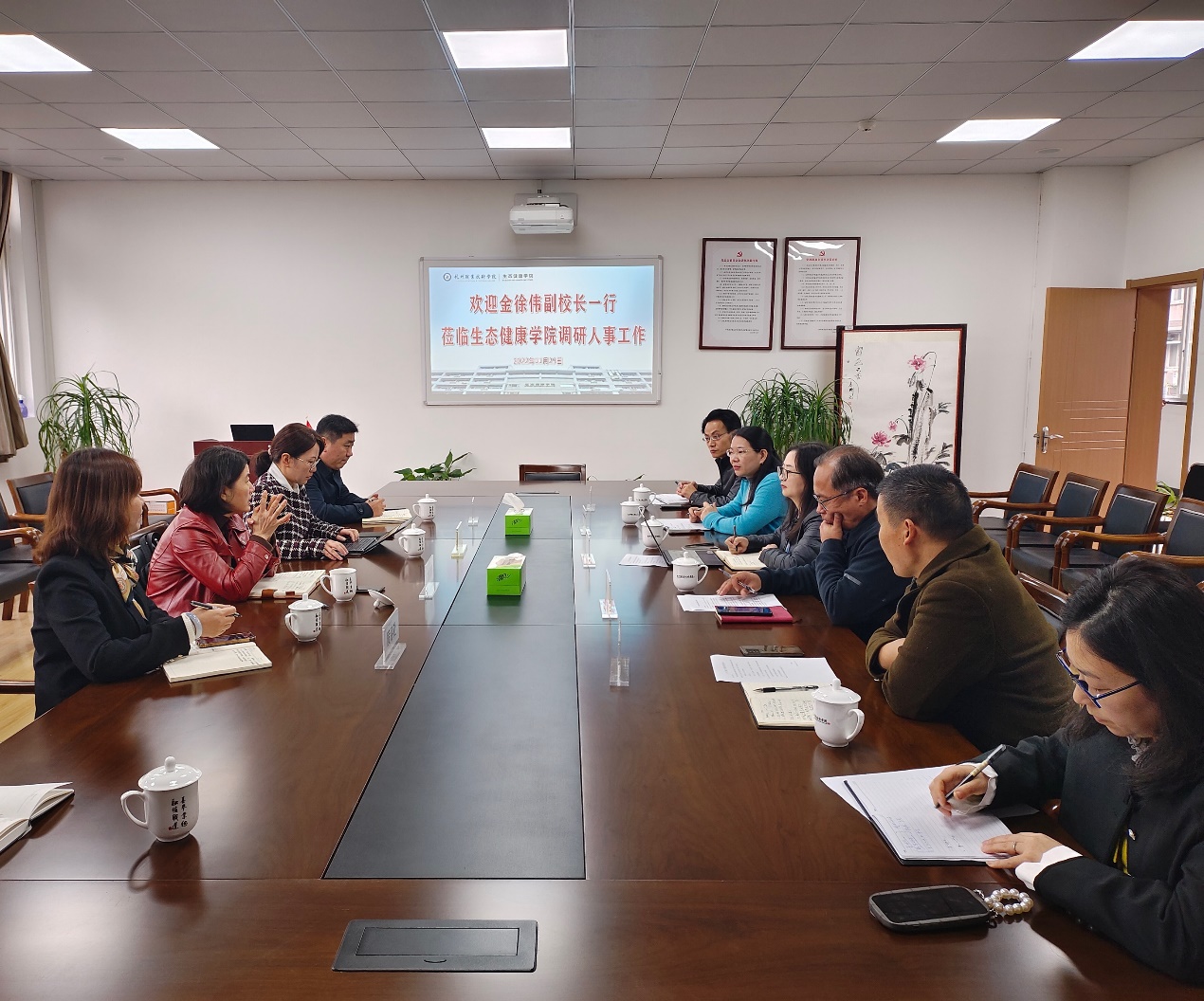11月29日上午,副校长金徐伟、人事处处长龙艳、质评处处长戴凤微、教务处副处长许普乐等一行在生态健康学院开展人事专项工作调研。分院院长何艺、党总支书记张崇生、副院长干雅平及专业负责人代表参加调研座谈会。