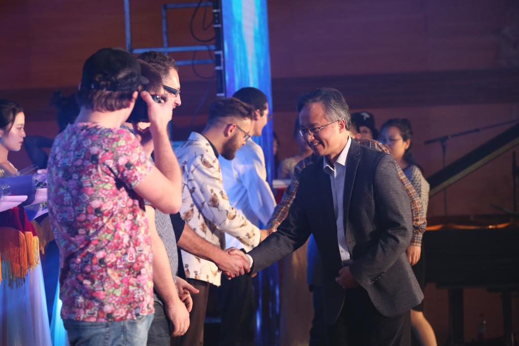 演出结束后,杨建华副秘书长、安蓉泉书记和贾文胜校长一起上台向波兰演职人员献上了鲜花,给他们披上了由我校达利女装学院同学们设计的丝巾,并赠送了由贾文胜校长亲笔题写的“中波友谊天长地久”字幅。到场来宾与中波双方演职人员一起合影留恋,将演出现场氛围推向高潮。同学们久久不肯散去,纷纷登台与波兰演职人员自拍合影、签名留念,友好氛围令人动容。
