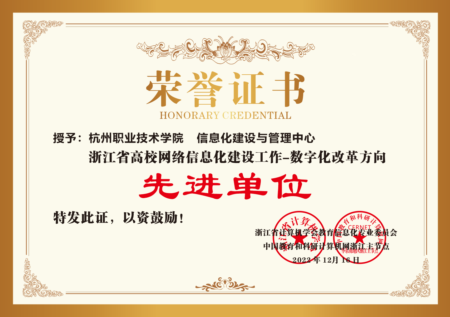 日前,由浙江省计算机学会、中国教育和科研计算机网浙江省主节点组织的2022年度浙江省高校网络信息化建设工作先进评审揭晓。我校荣获浙江省高校网络信息化建设工作数字化改革方向先进单位,李虎老师荣获先进个人。