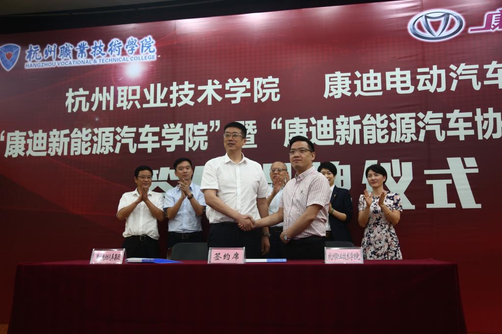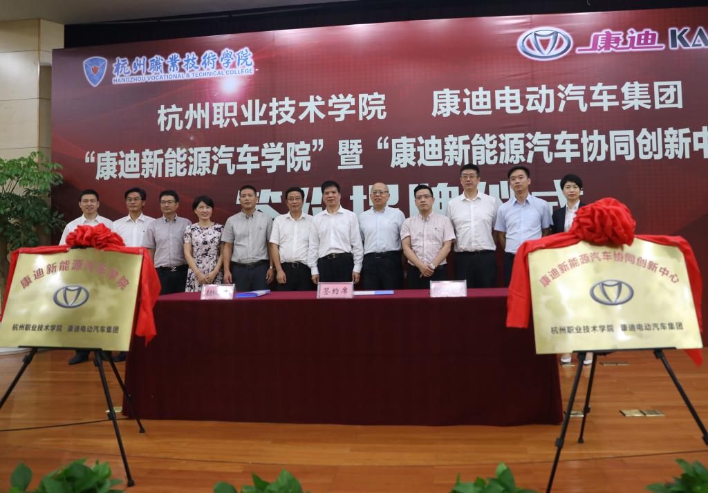 随后,康迪电动汽车集团总裁朱峰与杭州职业技术学院校长贾文胜进行了签约,双方将合作共建康迪新能源汽车协同创新中心(康迪新能源汽车学院、康迪新能源汽车研究院、共享汽车研究中心)。胡晓明、朱峰、安蓉泉、贾文胜共同为“康迪新能源汽车学院”暨“康迪新能源汽车协同创新中心”揭牌。